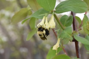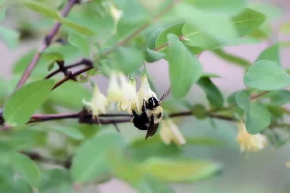 The bumblebees are all over the haskap flowers in the food forest. You can hear the bush buzzing even if you can’t see all the bees.